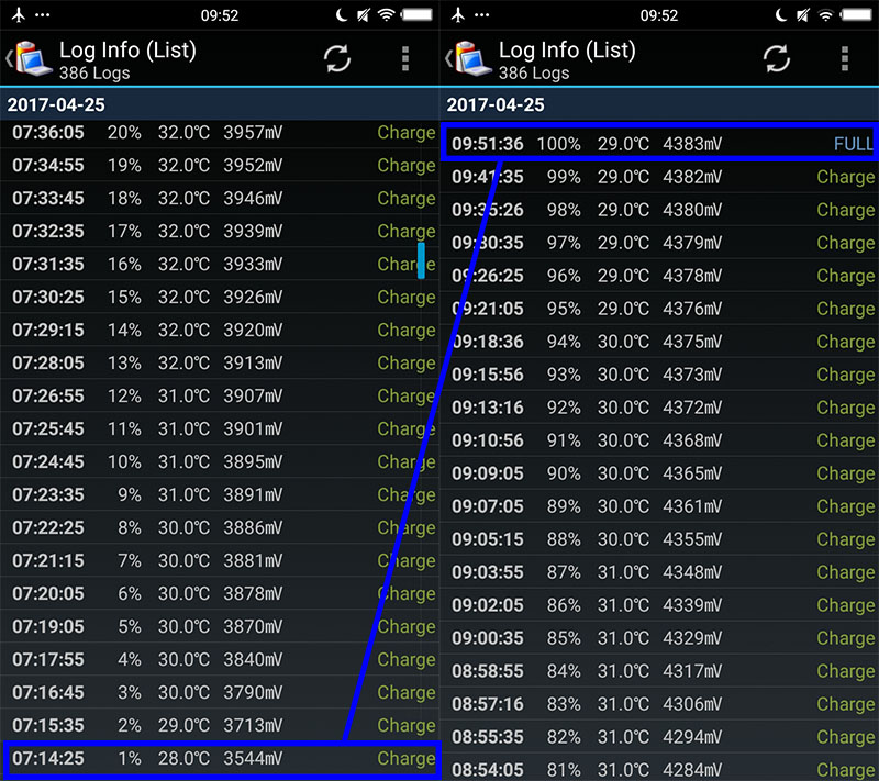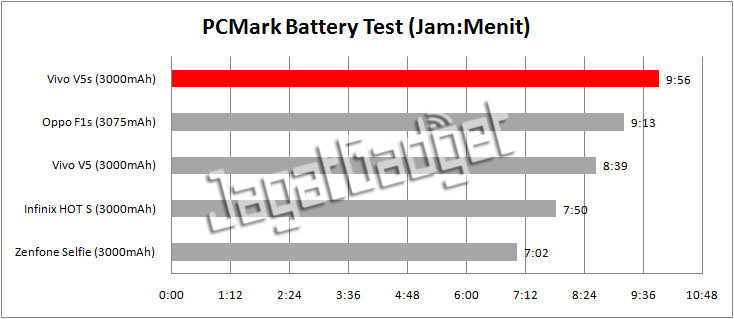 Sementara untuk uji pengisian ulang baterai, Vivo V5s terisi ulang penuh dari 1% hingga 100% membutuhkan waktu 2 jam 37 menit.