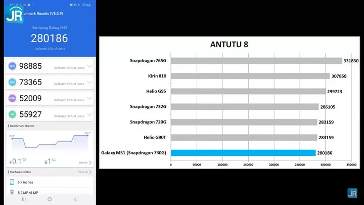 Untuk pengujian performa di review Samsung Galaxy M51 ini, kami melakukannya dengan aplikasi benchmark seperti di antaranya AnTuTu, Geekbench, 3DMark dan GFX Bench, dan juga gaming.