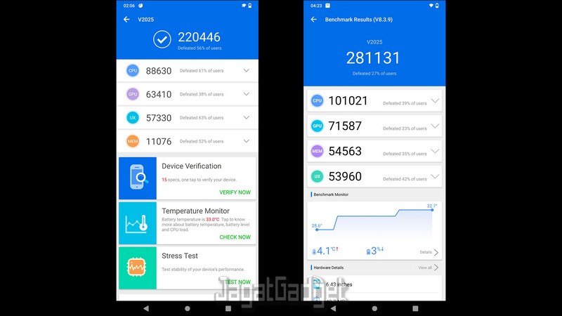 Untuk menguji performa dari Vivo V20, seperti biasa kami menggunakan set benchmark yang umum kami pakai ketika menguji sebuah performa dari smartphone. Tes yang kami pakai kali ini terdiri dari AnTuTu, Geekbench, 3DMark Sling Shot, dan GFXBench.