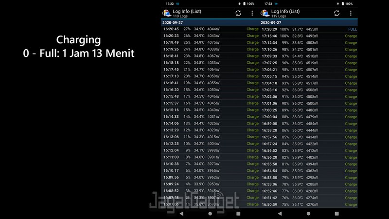 Sementara di pengujian kecepatan Charging, perangkat bisa terisi penuh 100% dalam waktu 1 jam 13 menit. Pengisian selama 27 menit pada perangkat ini sendiri bisa mengisi daya baterai dari kosong hingga 50%.