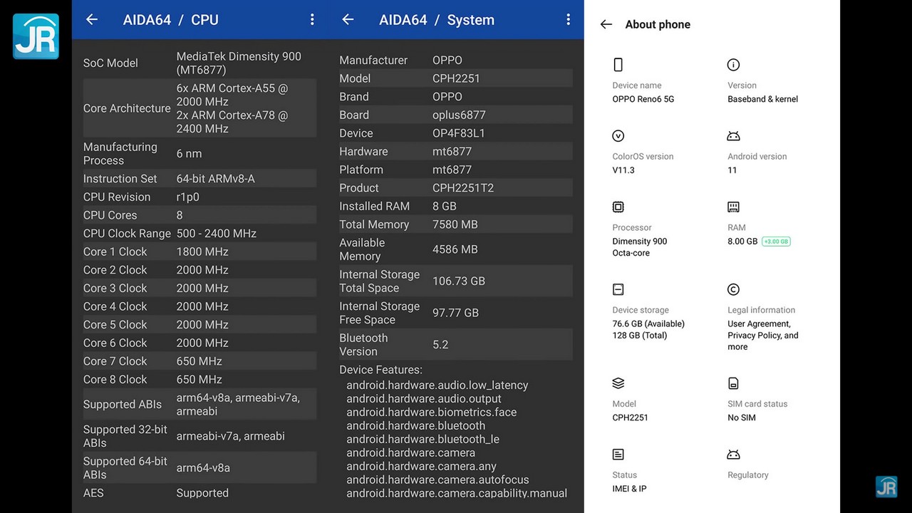 Sedangkan untuk spesifikasi yang diusung oleh OPPO Reno6 5G yaitu mulai dari SoC Dimensity 900 (6 nm) yang memiliki konfigurasi CPU 2x Cortex A78 2.6 GHz + 6x Cortex A55 2.0 GHz dan GPU Mali-G78 MC4.