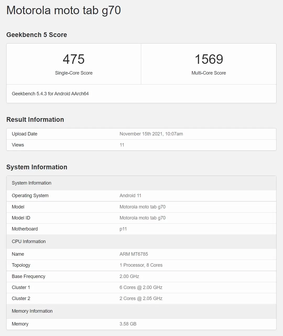 Dari halaman Geekbench 5, tablet ini memiliki skor awal Single Core 475 dan Multi Core 1569. Menariknya, di halaman yang sama, spesifikasi dari chipset yang akan diusungnya lebih mirip dengan MediaTek Helio G90T, sehingga kemungkinan besar informasi yang didapat dari Geekbench lebih valid daripada Google Play Console.