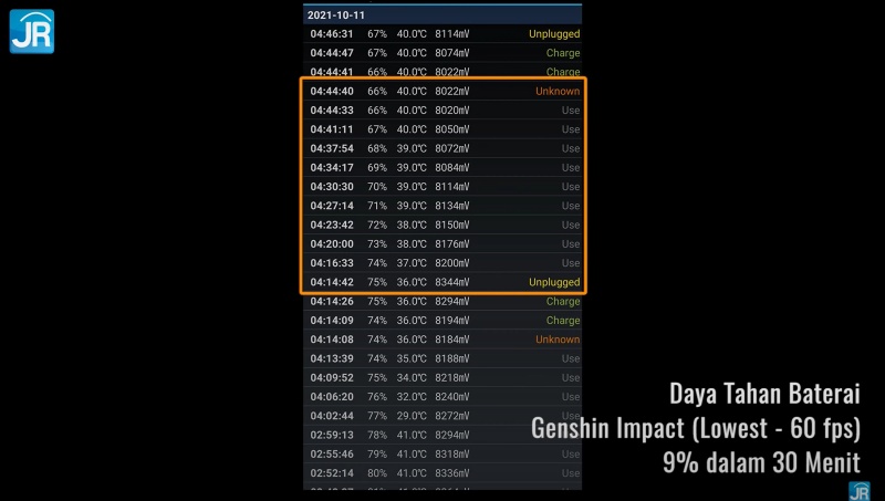 - Genshin Impact (Lowest – 60 fps): berkurang 9% dalam 30 menit.