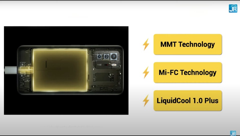 MMT itu adalah singkatan dari Middle Middle Tab, sebuah tekn ologi pengisian baterai yang dimulai dari tengah baterai dan pengisian daya yang dibelah, tujuannya adalah meminimalisir peningkatan suhu berlebih saat charging. Sedangkan Mi-FC adalah teknologi untuk menjaga pengisian baterai tetap kencang, jadi arusnya akan bisa tetap tinggi. Kalau LiquidCool 1.0 Plus tadi seperti yang kita lihat tadi, untuk membantu penyebaran suhu yang lebih baik, tidak hanya untuk processor, tapi baterai juga.