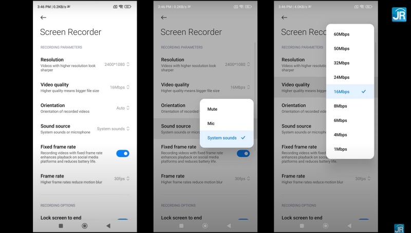 - Screen Recorder bawaannya adalah screen recorder standard di MIUI. Untuk fiturnya tergolong cukup ideal, bisa rekam suara internal, bisa atur bitrate, bisa pilih framerate variable atau fixed. Fixed Framerate sayangnya masih dilimitasi di 30 FPS.