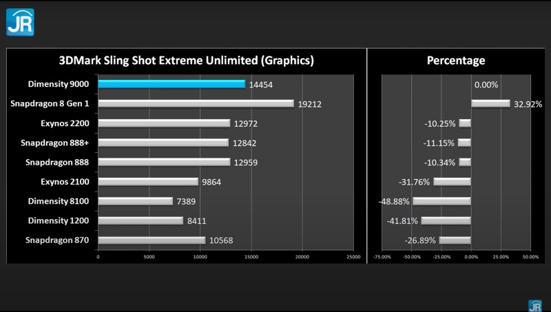 Beralih ke pengujian GPU, di 3DMark Sling Shot Extreme Unlimited dengan basis OpenGL ES 3.1 ini, skor yang didapat Dimensity 9000 sekitar 33% di bawah skor Snapdragon 8 Gen 1. Tapi, kalau dibandingkan SoC kelas atas lain, skornya unggul, hampir 42% dari Dimensity 1200, serta 10% dari Snapdragon 888.