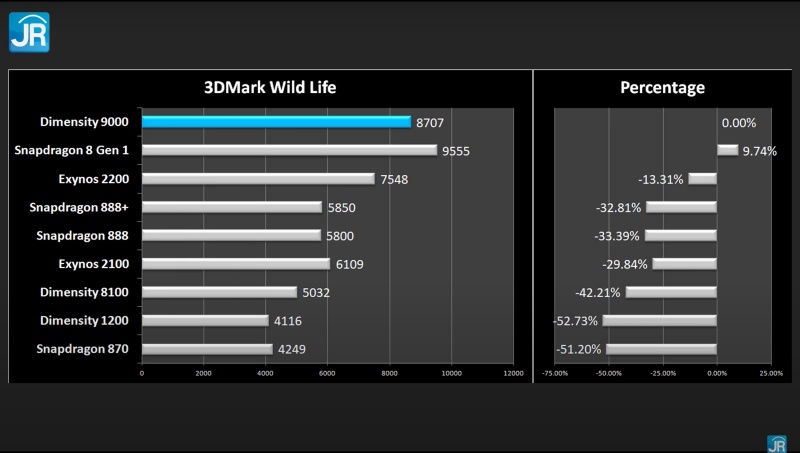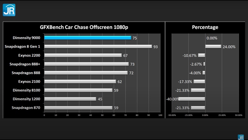 Hasil yang didapatkan di Car Chase, SoC ini sedikit tertinggal dari Snapdragon 8 Gen 1, mirip dengan hasil Snapdragon 888 dan Snapdragon 888+, tapi unggul cukup jauh dari SoC-SoC kelas atas lain, bahkan Exynos 2200. Keunggulan SoC ini mencapai 40% di atas Dimensity 1200 serta 21% di atas Snapdragon 870 serta Dimensity 8100.