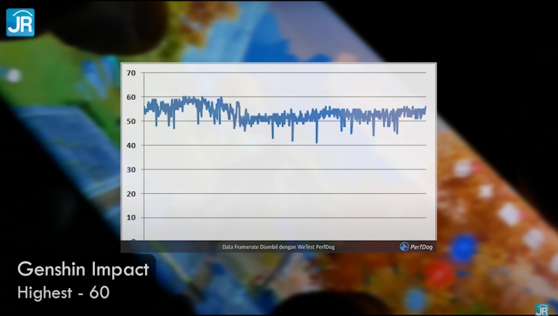 Setting yang kami gunakan Highest – 60. Kami bisa mendapatkan 52 – 60 fps di awal pengujian, kemudian setelah sekitar 9 menit, framerate tertahan di kisaran 52 – 54 fps sampai sekitar 30 menit kami memainkan game ini. Framerate ini Sesekali saja bisa ada penurunan ke sekitar 40 fps, tapi hal ini terbilang normal untuk game Genshin Impact ini.