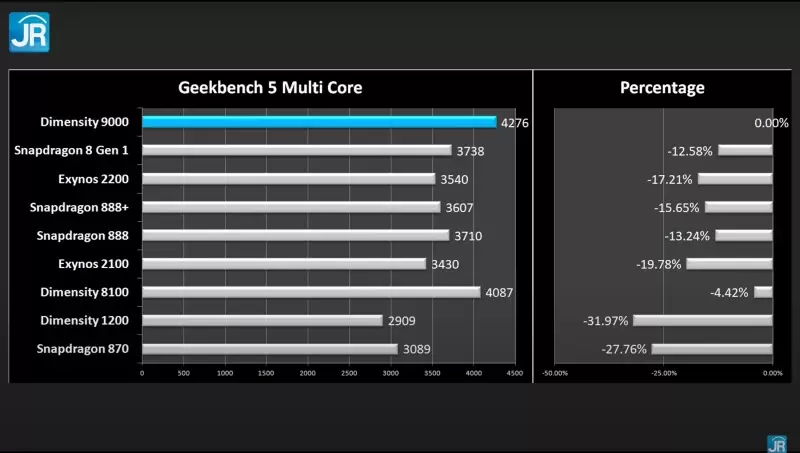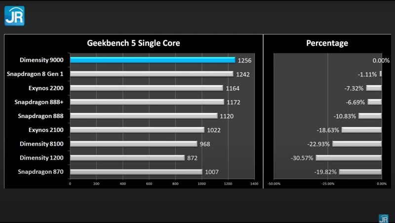 Benchmark ini menguji CPU dari SoC. Hasil single core, kurang lebih mirip dengan hasil dari Snapdragon 8 Gen 1, 30% di atas Dimensity 1200, 18% di atas Dimensity 8100, 7% di atas Snapdragon 888+.