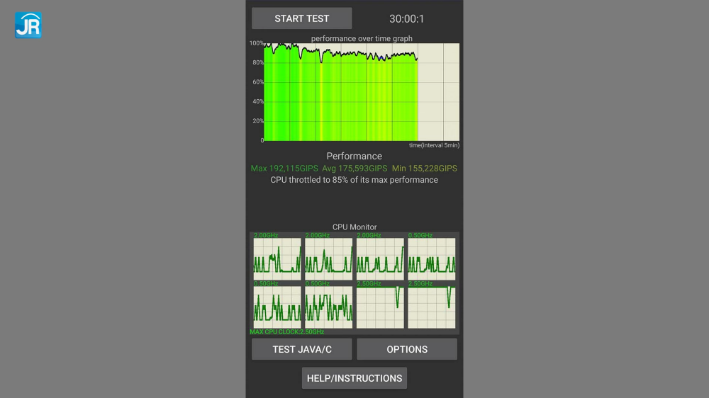 - CPU Throttling Test hanya throttle ke 85% dalam tes selama 30 menit.