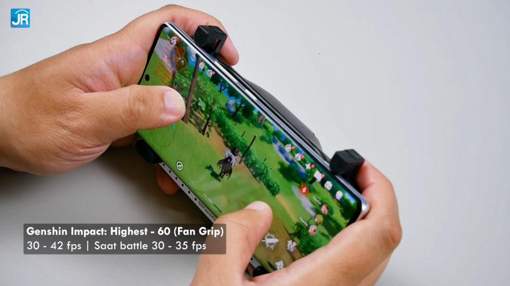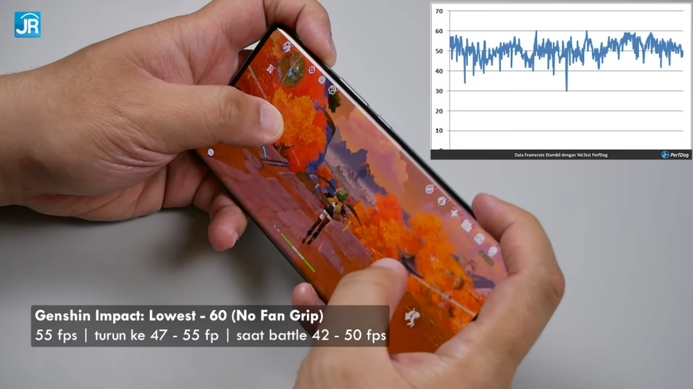 Melihat framerate yang didapatkan bisa setinggi itu, kami iseng mencoba setting Highest – 60 dan kami masih menggunakan fan grip. Hasilnya, game ini masih bisa dijalankan di kisaran 30 – 42 fps. Saat ada battle, framerate akan lebih banyak di kisaran 30 – 35 fps. Hanya sesekali saja bisa turun di bawah itu, tapi hanya ke sekitar 28 – 29 fps, dan cepat kembali lagi ke atas 30 fps. Jadi, kalau mau main dengan kualitas tampilan tinggi, masih bisa di smartphone ini!
