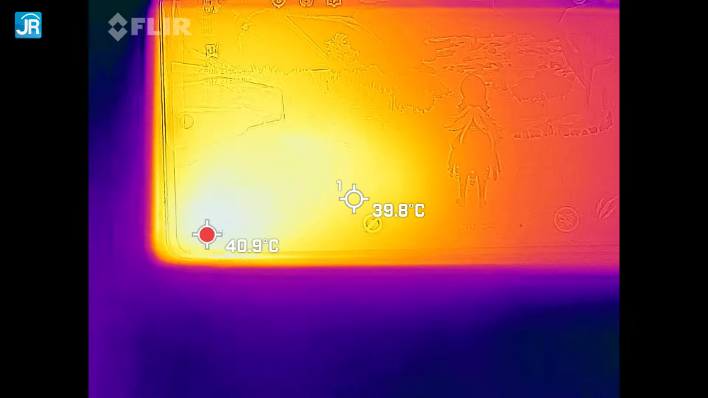 Setelah 30 menit, kami coba ukur suhu permukaan smartphone. Untuk sisi depan, titik terpanas ada di area atas layar, di kiri kamera selfie. Suhunya bisa mencapai sekitar 40°C – 41°C. Panas terlihat disebarkan hanya ke 1/3 bagian atas layar saja. Area tengah dan bawah layar suhunya masih cukup rendah, 36°C ke bawah.
