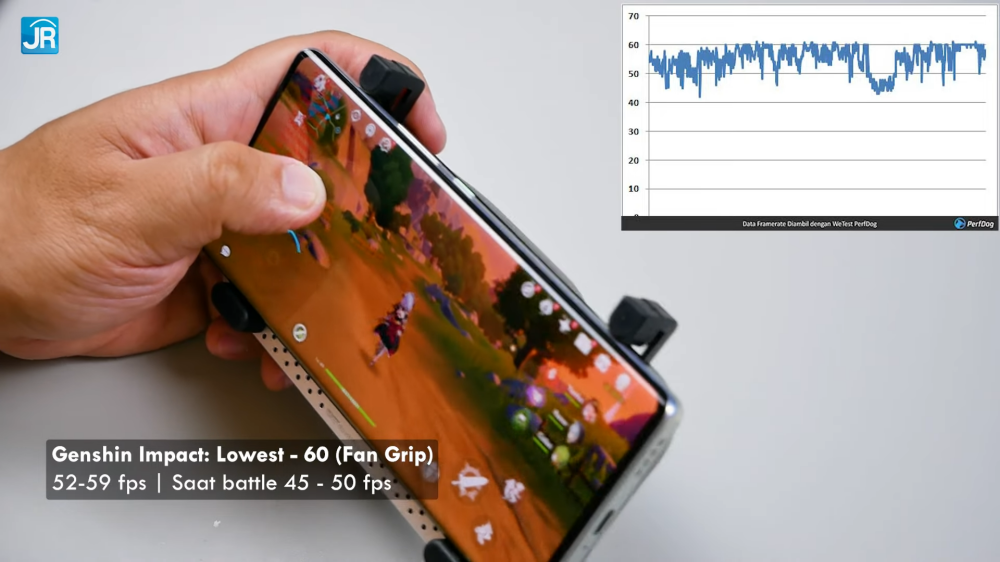 Lalu, kami coba pasang fan grip. Framerate yang didapatkan ternyata bisa cukup konsisten di atas 50 fps! Saat hanya menjelajahi dunia game ini, kami bisa mendapatkan 52 – 59 fps. Sementara saat ada battle, framerate akan lebih dekat ke 50 fps, sesekali saja turun sedikit ke bawah itu. Baru saat ada battle yang cukup panjang dan berat, framerate turun ke bawah 50 fps, tapi masih ada di kisaran 45 – 50 fps saja. Jadi masih terasa sangat nyaman game ini dimainkan.