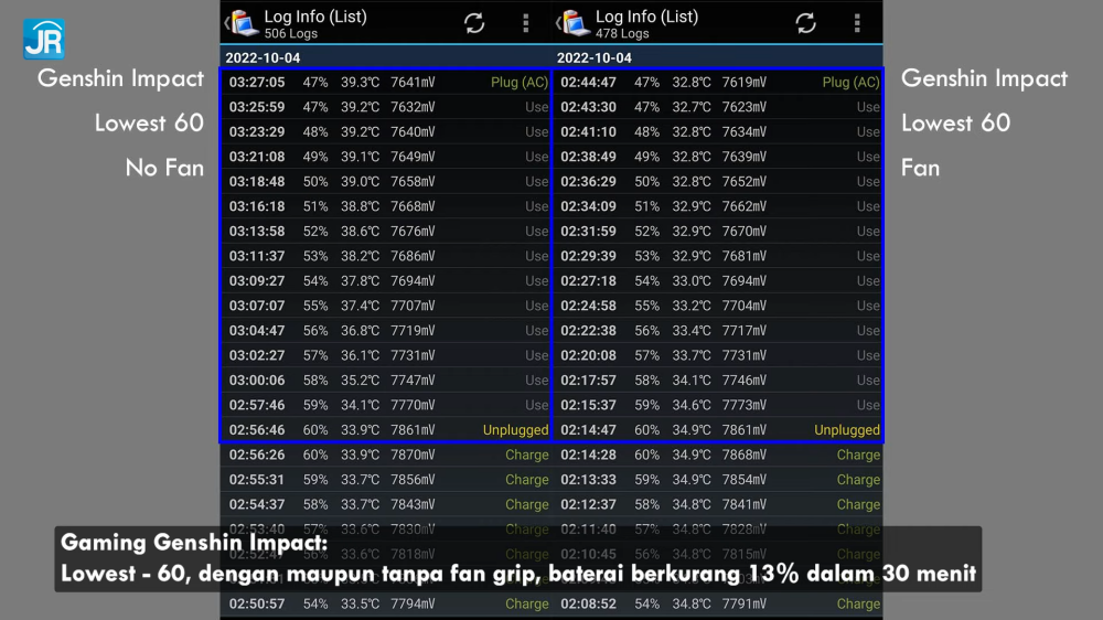- Highest – 60, dengan fan grip, baterai berkurang 17% dalam 30 menit.