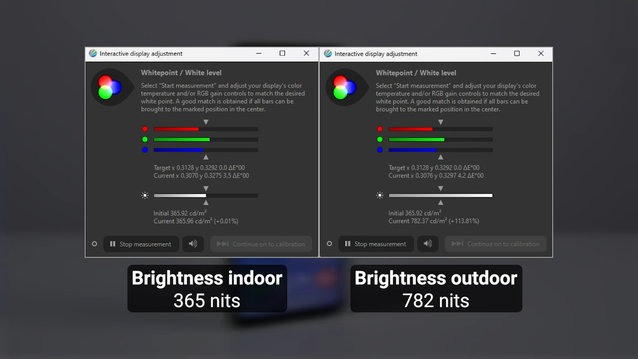 - Brightness: untuk pengujian indoor, brightness layarnya berada di kisaran 365 nits. Sedangkan di simulated outdoor, brightness layar ini bisa mencapai 782 nits.