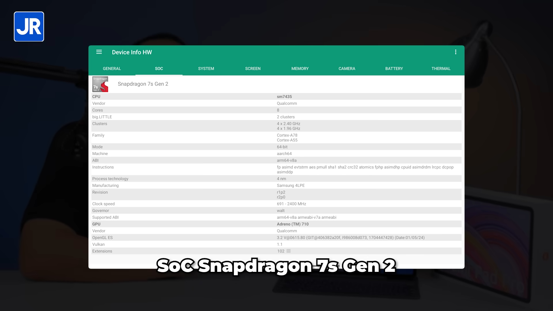 SoC: Snapdragon 7s Gen 2, dengan fabrikasi 4 nm. Ini SoC kelas menengah atas yang terbilang mumpuni.