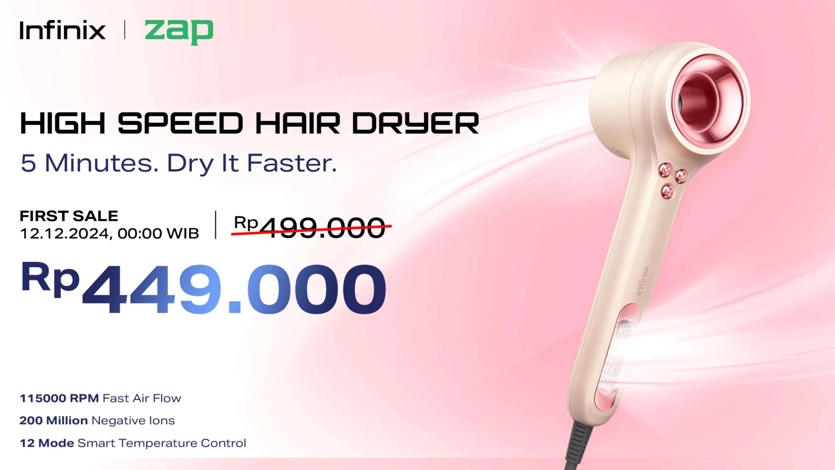 Mengusung tagline “5 Minutes, Dry It Faster”, Infinix High Speed Hair Dryer dirancang untuk memberikan pengalaman pengeringan rambut yang cepat dan efisien tanpa mengorbankan kesehatan rambut. Perangkat ini punya kecepatan motor hingga 115,000 rpm, untuk mengeringkan rambut ekstra cepat.