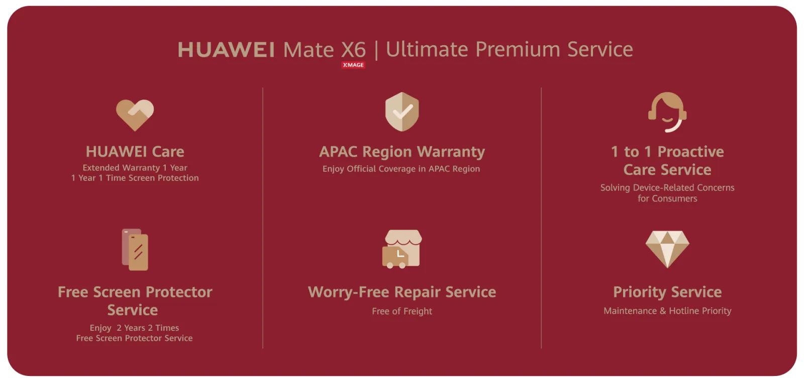 Sebagai perangkat yang tidak murah, tentu layanan purnajual akan menjadi salah satu pertimbangan bagi konsumen untuk membeli ponsel lipat seperti Mate X6. Oleh karena itu, setiap pembelian Mate X6 Huawei menyertakan layanan eksklusif senilai IDR 4,344K, yang dirancang untuk memberikan ketenangan dan layanan terbaik bagi pengguna. Apa saja manfaatnya?