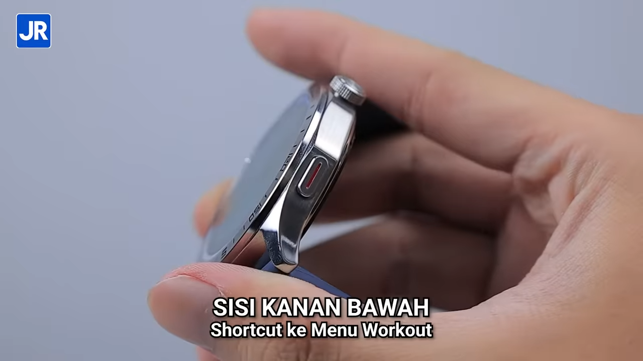 Di sisi kanan atas, terdapat rotating crow yang juga berfungsi sebagai tombol untuk navigasi menu. Selain itu, rotating crown ini juga bisa diputar untuk scrolling menu. Lalu di kanan bawah ada tombol dengan sentuhan aksen merah, yang berfungsi sebagai shortcut ke menu workout. Tombol ini juga bisa kita ganti fungsinya untuk mengakses fitur-fitur lain.