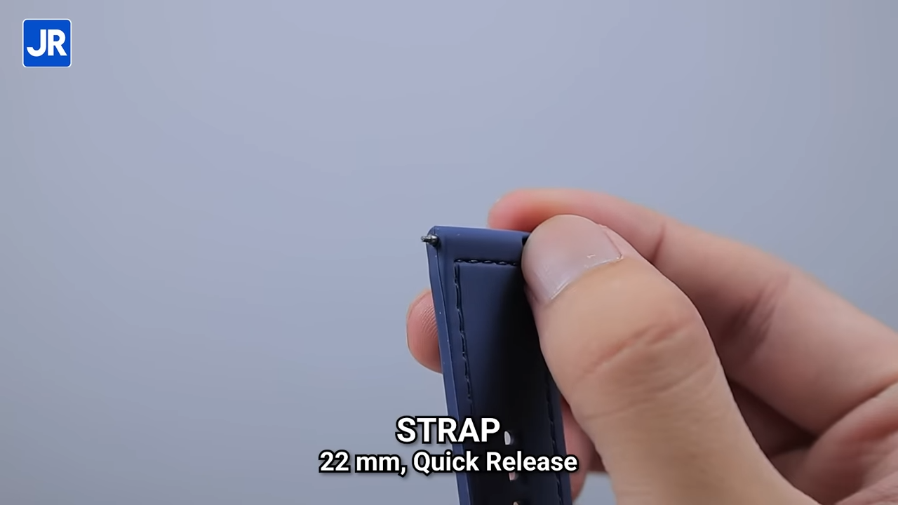 Untuk materialnya, bodi smartwatch ini menggunakan Zync Alloy. Sementara untuk strap bawaannya menggunakan bahan silicone, dengan motif jahitan seperti ini. Ini adalah strap 22 mm dengan mekanisme quick release. Jadi mau lepas pasang strap-nya mudah sekali ini. Smartwatch ini dilengkapi dengan sertifikasi ketahanan air hingga 5 ATM, atau sampai kedalaman 50 meter. Mau dibawa berenang, ini bisa banget.