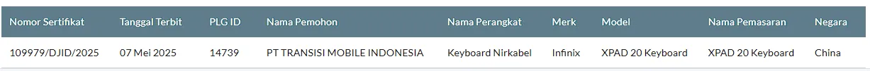 Ada indikasi Infinix bakal memboyong tablet XPAD 20 tersebut ke Indonesia. Aksesori “XPAD 20 Keyboard” terpantau telah mendapatkan sertifikasi dari SDPPI Postel Komdigi. Namun, untuk perangkatnya sendiri saat artikel ini ditulis masih belum muncul.