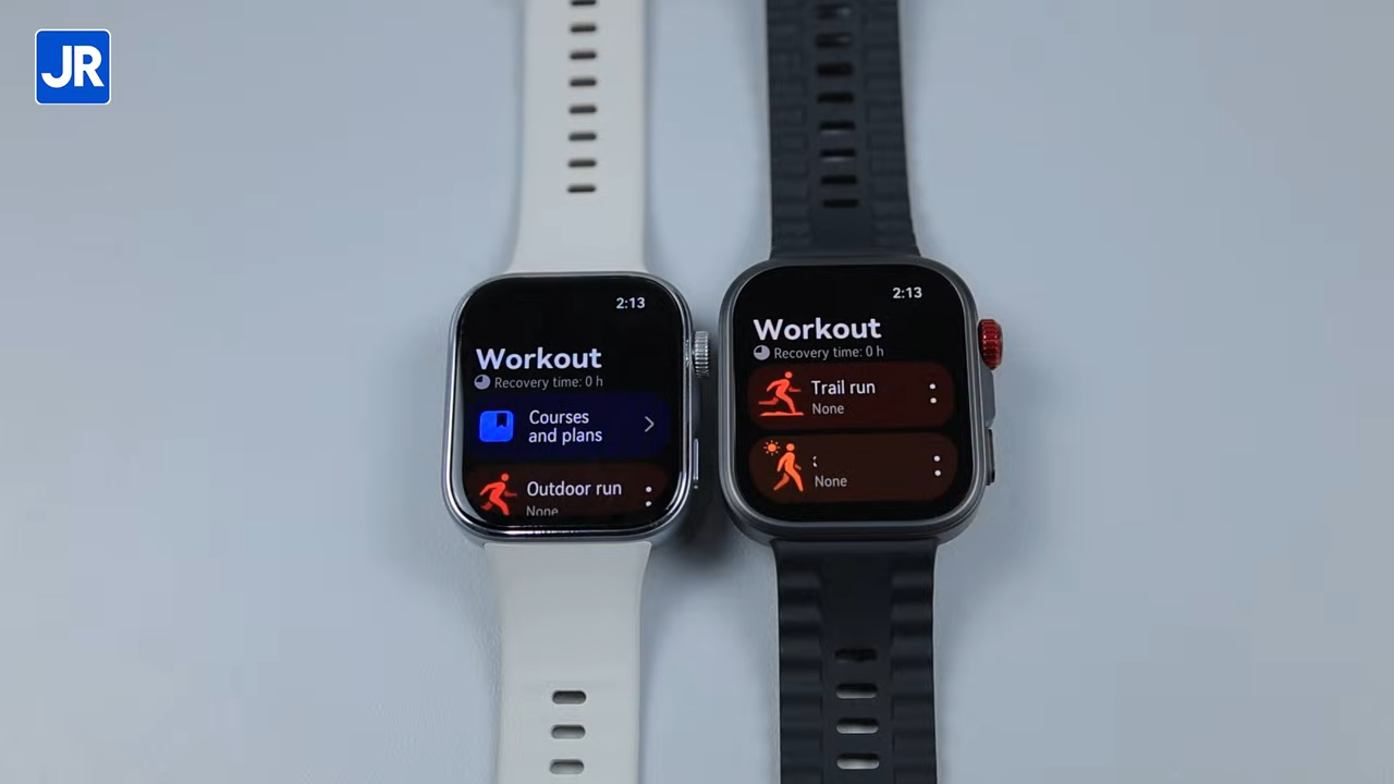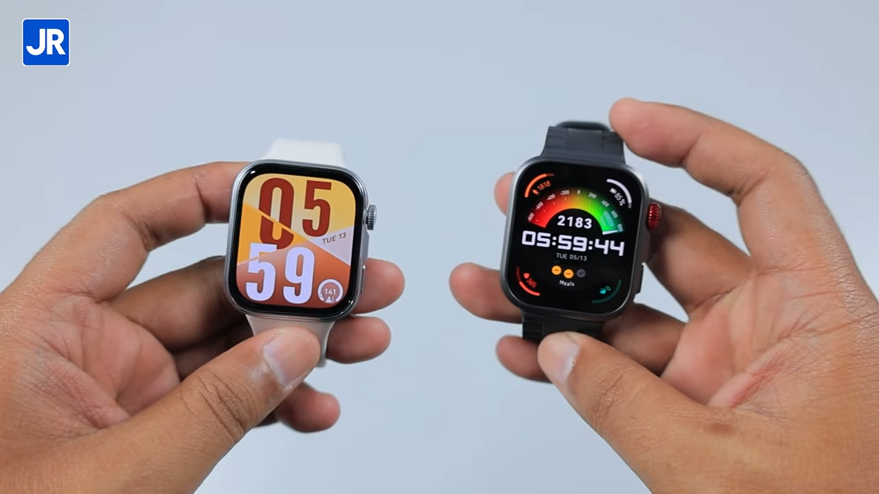 Keduanya sama sama mengadopsi desain dengan bentuk kotak, yang terkesan simple tapi tetap stylish. Keduanya juga sama sama dilengkapi dengan rotating crown, tombol yang fungsi nya bisa di custom, microphone, dan speaker yang terletak di sekeliling bodinya. Untuk daya tahan terhadap air, keduanya juga sama sama sudah memiliki 5 ATM Water Resistant. Jadi aman kalau mau diajak berenang dengan kedalaman hingga 50 meter.