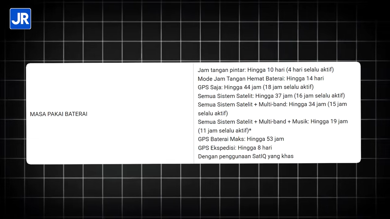 Baterai yang digunakan berbahan lithium ion dan dijanjikan bisa mencapai 10 hari penggunaan sebagai jam biasa atau 4 hari kalau pakai Always On Display.