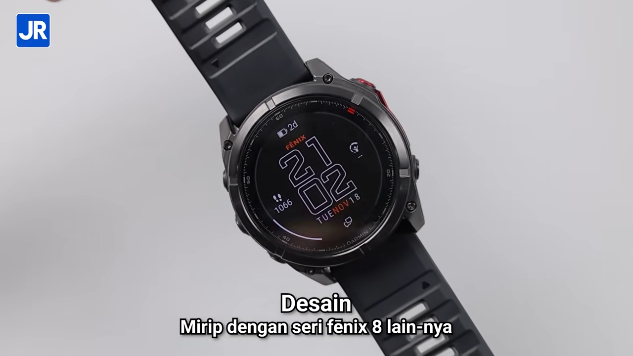 Jam berukuran besar ini secara tematik berwarna hitam. Desainnya sekilas sama dengan Fenix 8 series lainnya.