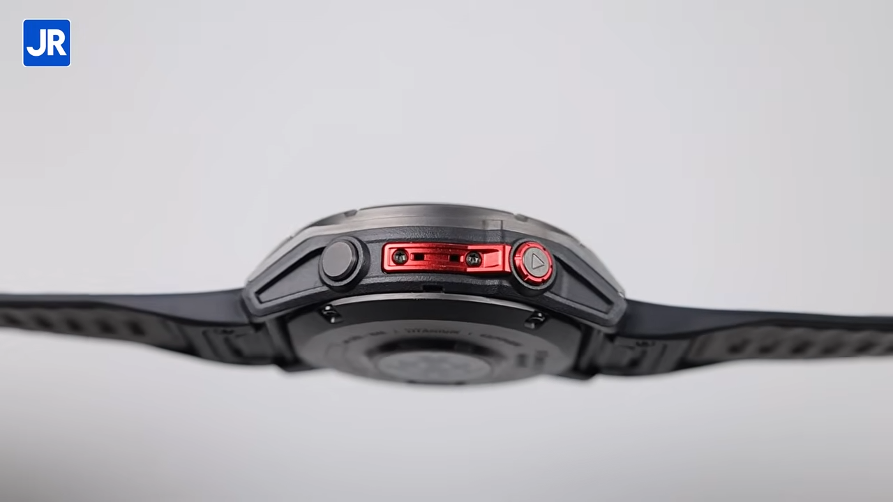 Di antara kedua tombol di kanan ada sebuah guard berwarna merah metalik yang melindungi mikrofon dan sensor barometer. Bisa jadi, ini pembeda dari Fenix 7 yang belum ada depth sensor untuk menyelam.