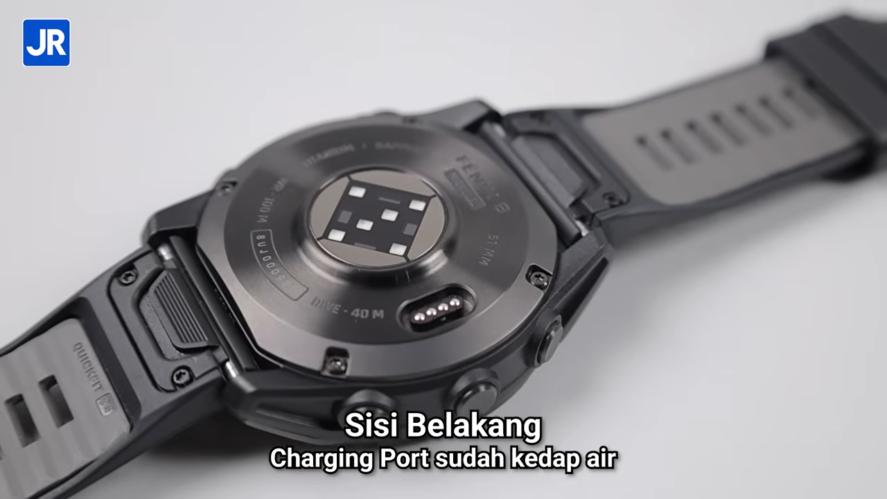 Beralih ke sisi belakang, kita bisa melihat ada charging port sekaligus data port dengan 4 titik konektor. Tenang, meskipun tanpa penutup, port ini sudah kedap air kok. Saat menggunakan jam, kami sih tidak merasakan adanya port ini.