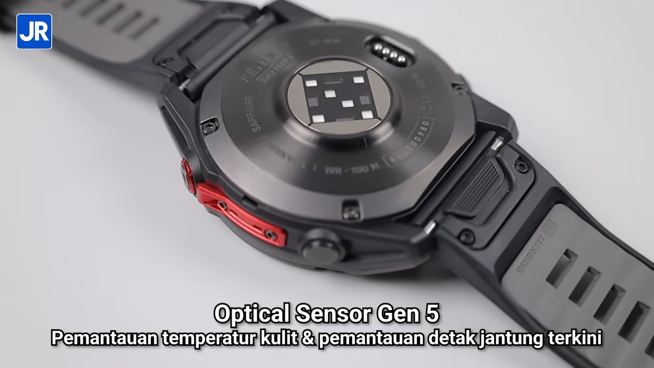 Kemudian di bagian tengah ada optical sensor generasi ke-5 yang sudah memiliki kemampuan pemantauan ECG, yang kurang lebih seperti ini ya. Selain itu, sensor ini juga bisa melakukan pemantauan temperatur kulit, dan merupakan sensor pemantauan detak jantung terkini dari Garmin.