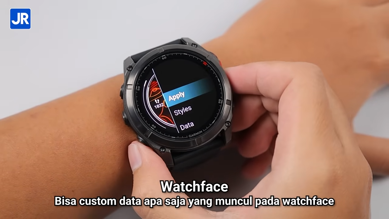 Ini adalah watchface default dari Garmin Fenix 8 MicroLED. Pada dasarnya watchface Garmin itu bisa di-custom data yang ditampilkannya, dengan masuk ke menu watchface, lalu tekan tombol kanan-atas dan memilih opsi DATA.