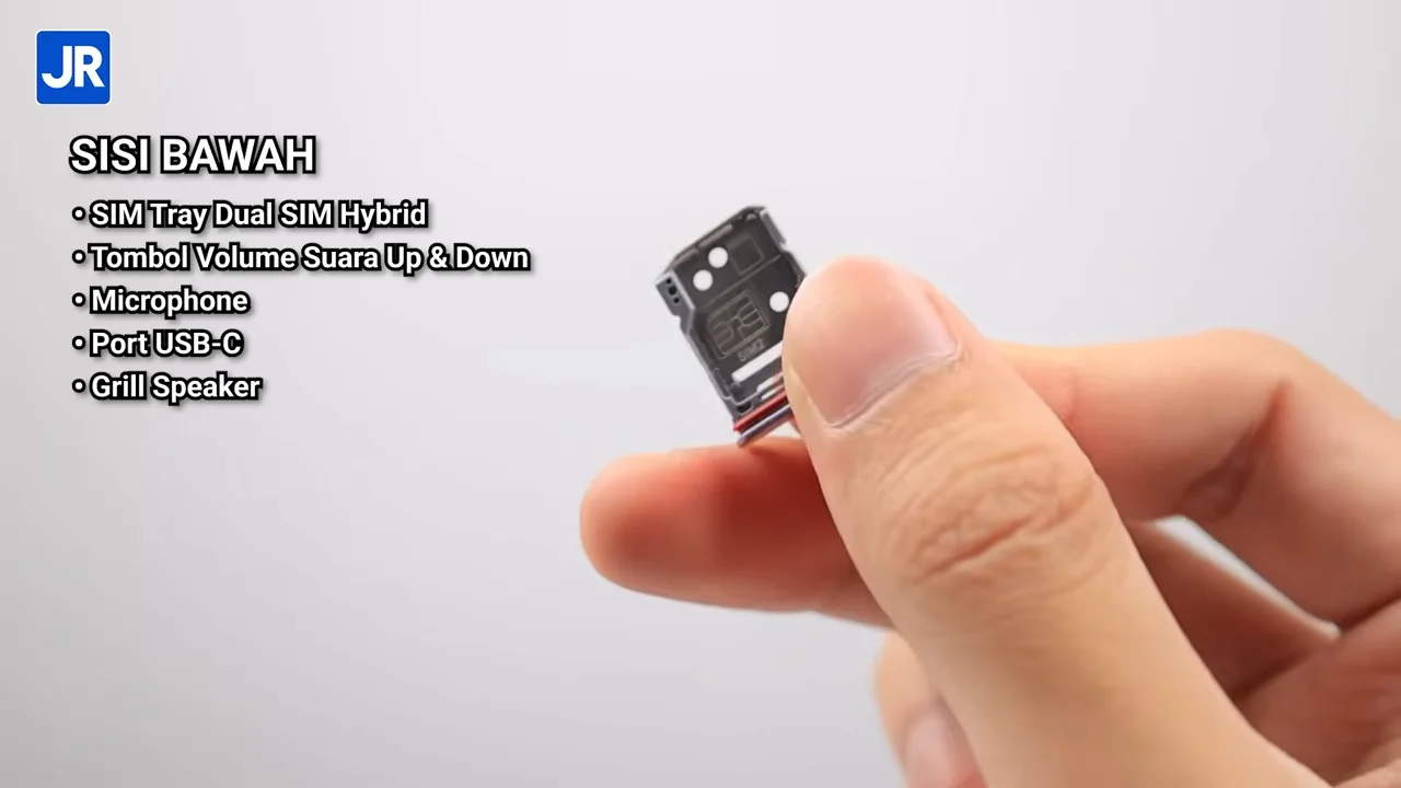 Sisi Bawah: SIM Tray (Dual SIM Hybrid, bisa Dual Nano SIM atau 1 Nano SIM + MicroSD Card), Microphone, Port USB-C, dan Grill speaker.