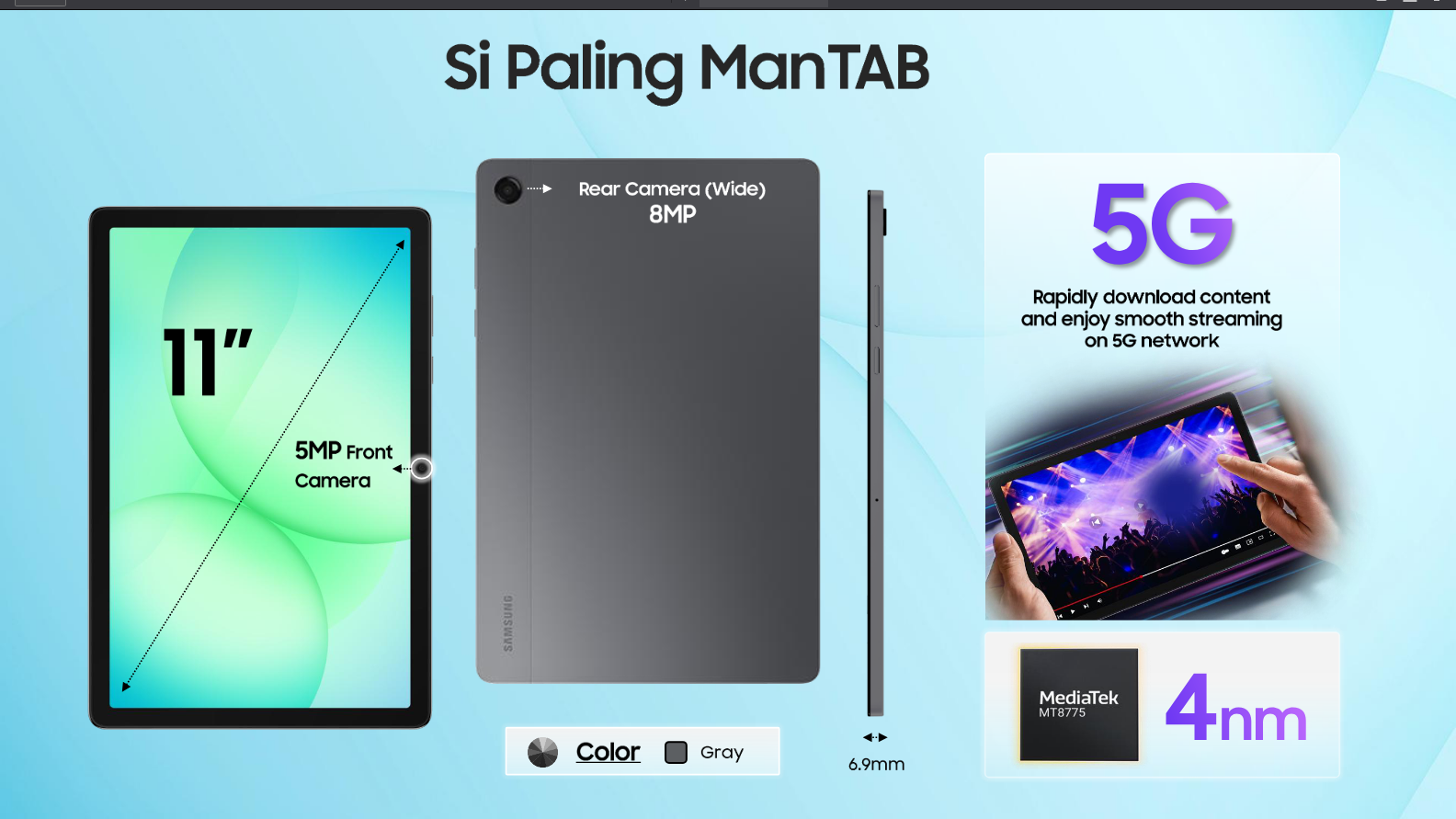Dari sisi desain, Galaxy Tab A11+ mengusung tampilan ramping yang terinspirasi dari Galaxy S Series. Tablet ini hanya tersedia dalam warna Gray dan sudah mengantongi sertifikasi IP52, sehingga lebih tahan terhadap debu dan cipratan air. Samsung juga menjanjikan dukungan jangka panjang berupa tujuh generasi pembaruan software dan tujuh tahun update keamanan, lengkap dengan perlindungan Samsung Knox.