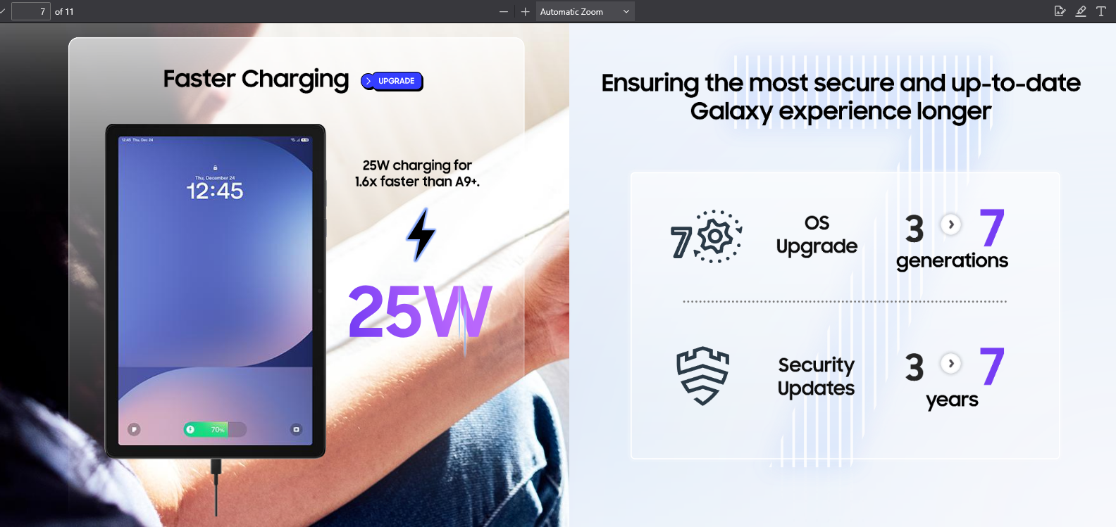 Tablet ini dibekali baterai 7.040 mAh yang dipadukan dengan dukungan fast charging 25W. Samsung mengklaim kombinasi tersebut cukup untuk menemani aktivitas seharian dengan waktu pengisian daya yang lebih singkat.