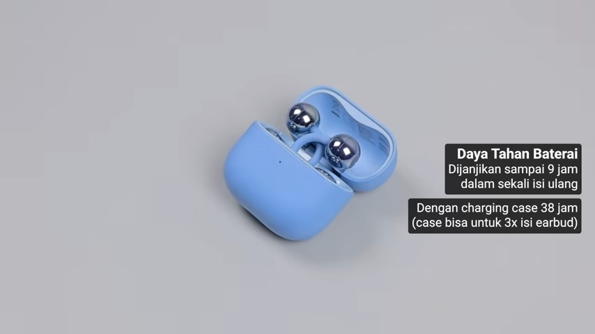 Untuk daya tahan baterai, dijanjikan sampai 9 jam dalam sekali isi ulang. Sedikit meningkat dari FreeClip. Kalau pakai charging case, disebut bisa sekitar 38 jam. Berarti, case bisa digunakan untuk mengisi ulang kedua earbud sekitar 3 kali.