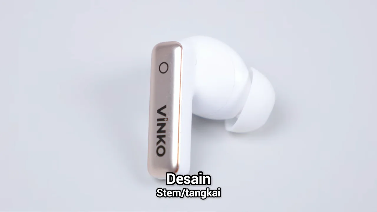 TWS ini menggunakan desain earbud dengan stem atau tangkai. Di sisi luar tangkai terdapat logo Vinko. Area logo ini juga jadi tempat touch input untuk pengendalian TWS. Lalu di ujung bawah tangkai terdapat lubang microphone dan dua konektor untuk charging TWS.