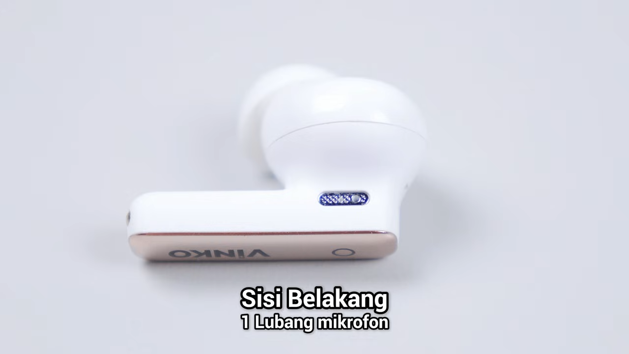 Di sisi dalam, terdapat penanda earbud kiri atau kanan. Kemudian di sisi belakang terdapat satu lubang microphone. Di sisi atas terdapat lubang ventilasi plus satu LED indikator berwarna putih. Di ujung bodi earbud, terdapat nozzle untuk driver TWS. Vinko menyebut driver TWS ini memiliki diameter 13 mm.