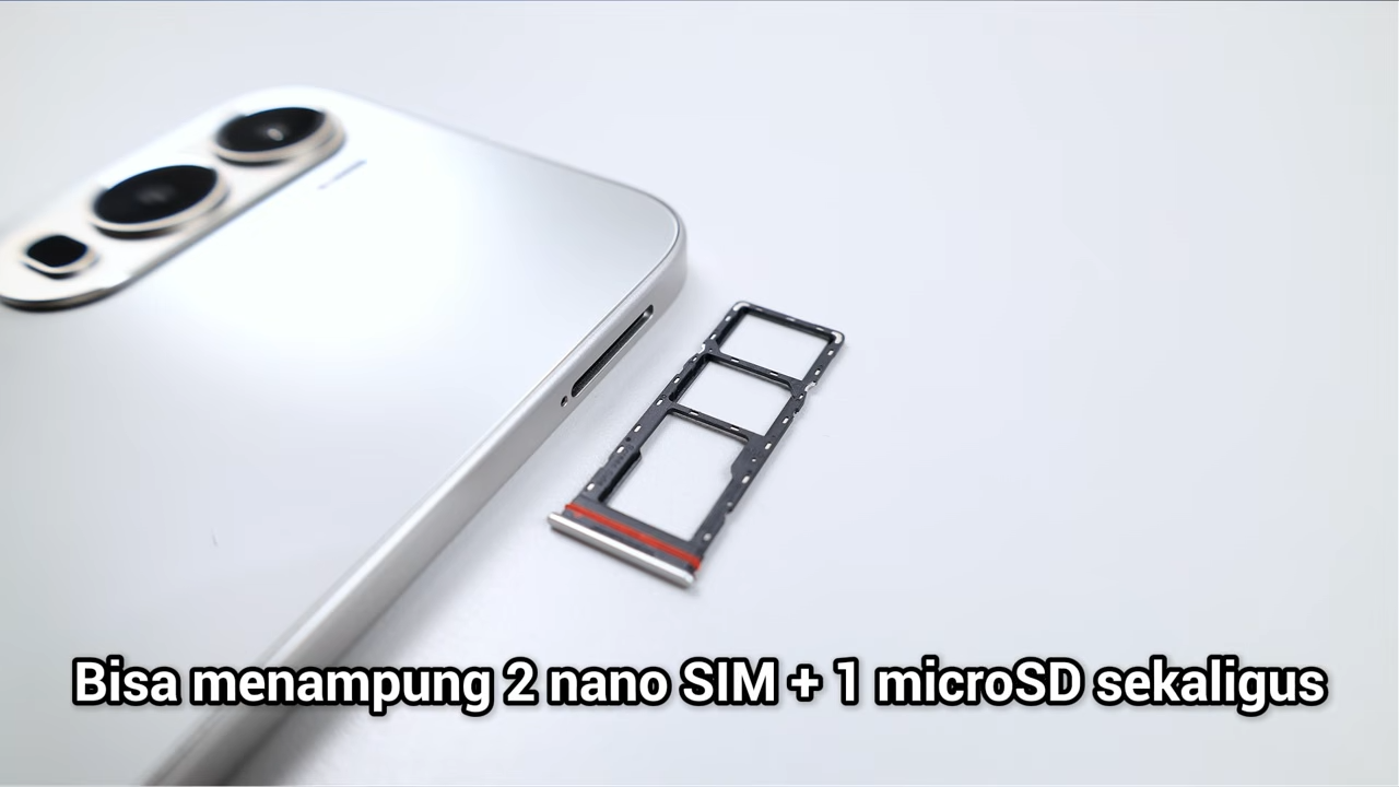 - Sisi kiri: SIM Tray triple slot, jadi smartphone ini bisa menampung dua nano SIM plus satu microSD sekaligus