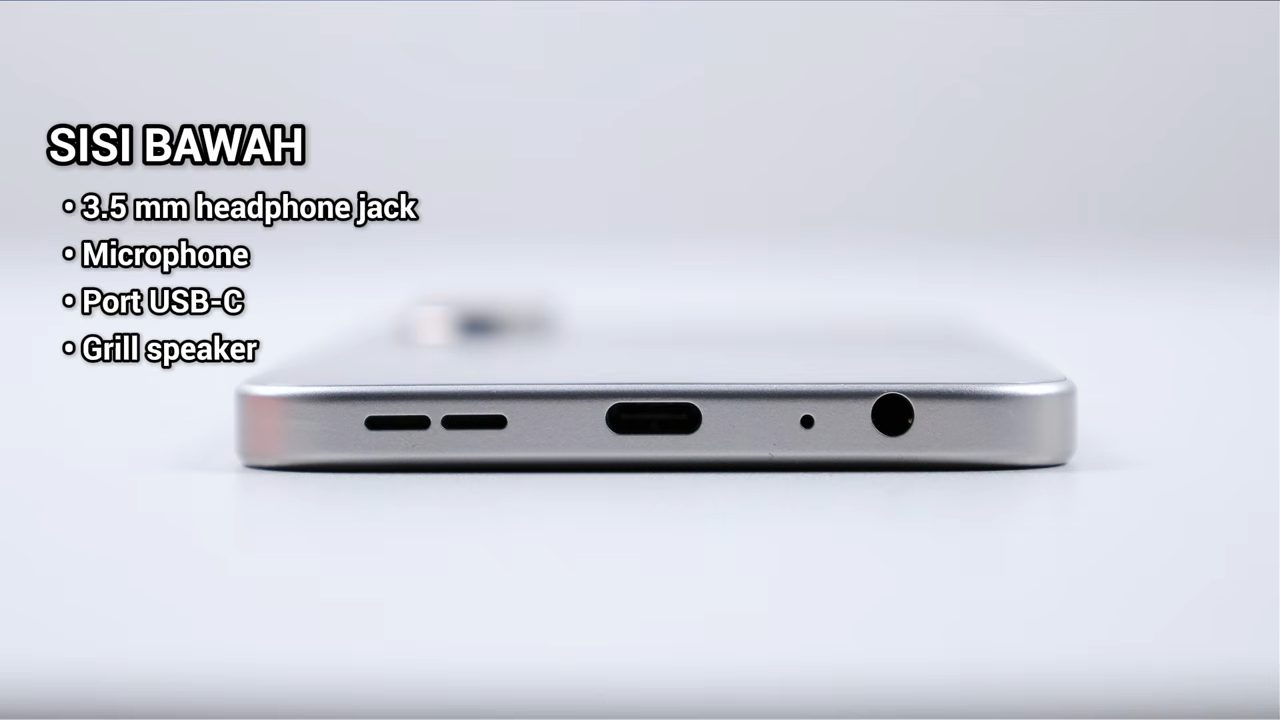 - Sisi bawah: 3.5 mm headphone jack, microphone, port USB-C, grill speaker
