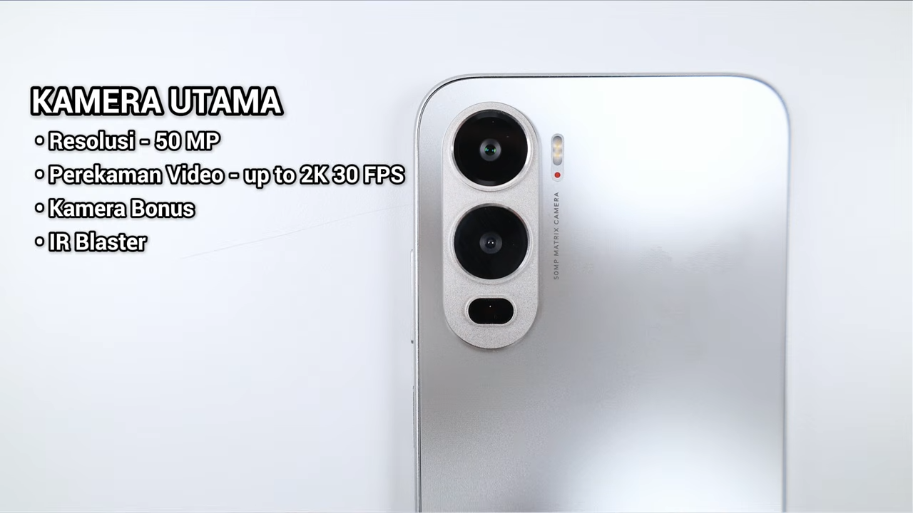 Ini adalah kamera utama 50 MP dengan perekaman video up to 2K 30 FPS. Lalu di bawahnya ada kamera bonus. Di bawahnya lagi terdapat Infrared Blaster. Jadi kita bisa pakai smartphone ini sebagai remote ya, baik untuk remote AC, TV, dan lain sebagainya.