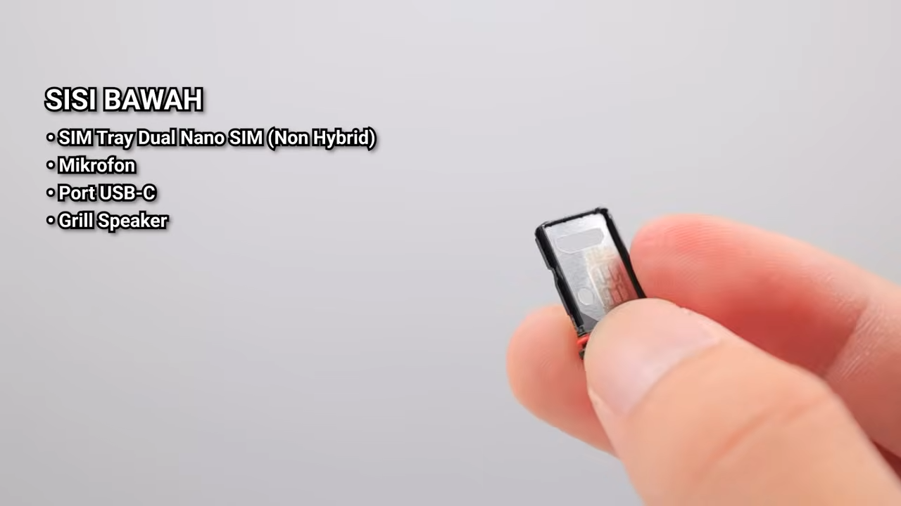 Sisi Bawah: SIM Tray Dual nano SIM (non Hybrid dan tidak ada slot untuk Micro SD Card), microphone, USB C, grill speaker stereo bagian bawah.